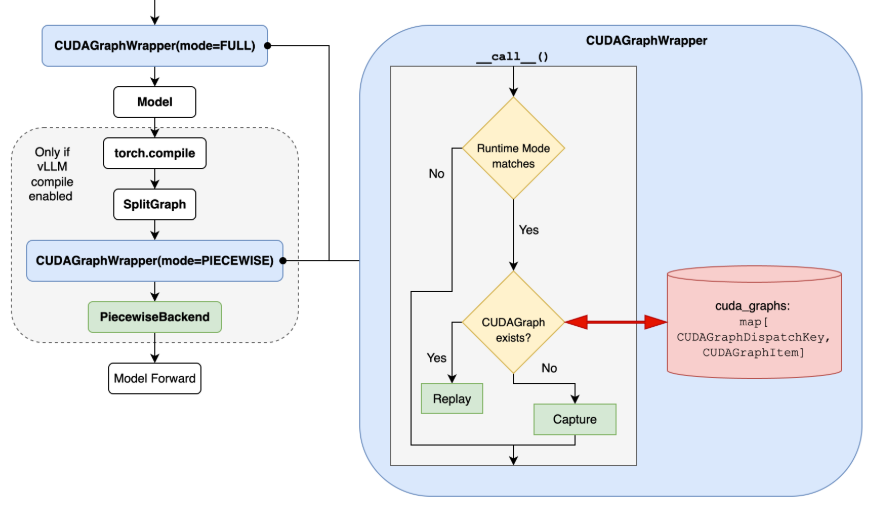 • CudagraphDispatcher: the central controller that contains the single source of truth about CUDA Graphs and handles dispatching between them.